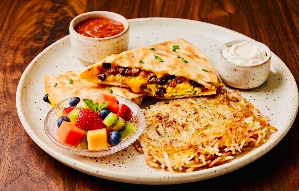 A toasted golden tortilla stuffed with savory chorizo, fluffy scrambled eggs, black beans, sweet corn, and melted cheese. Served with crispy hash browns, fresh seasonal fruit, sour cream, and salsa.VEGAN AVAILABLE