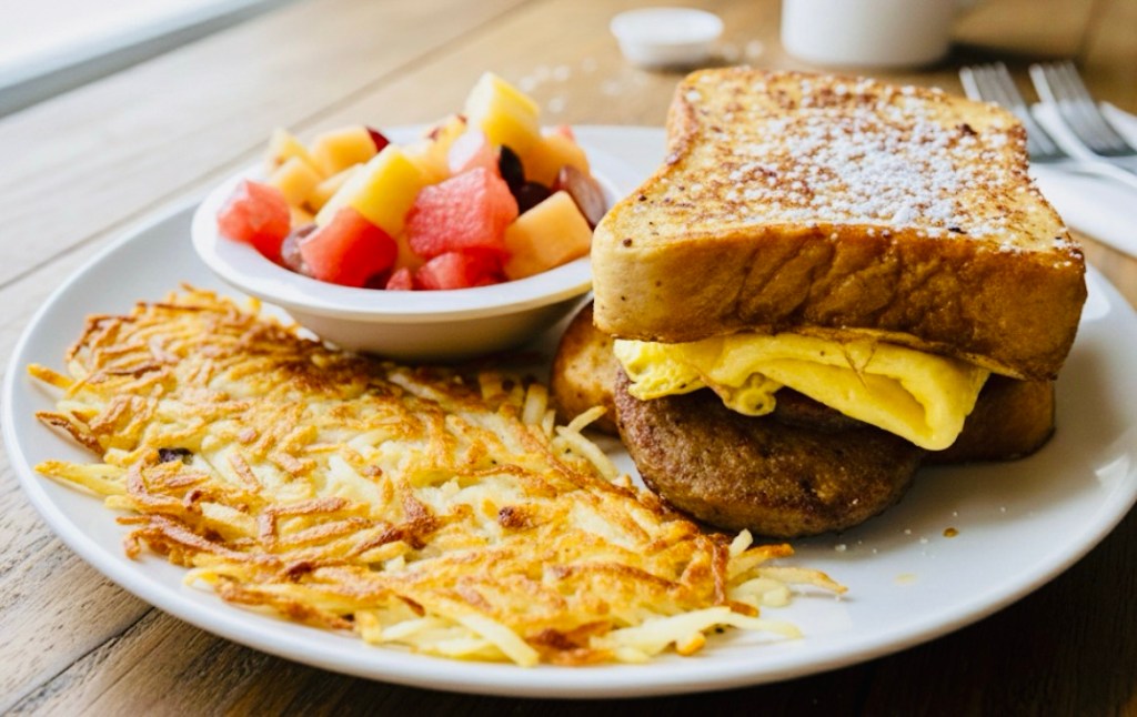 Our new breakfast special: breakfast French toast sandwich; hash brown patty, grilled sausage, , egg and cheese stuffed in two slices of French toast. Served with fruit and hash browns. VEGAN AVAILABLE