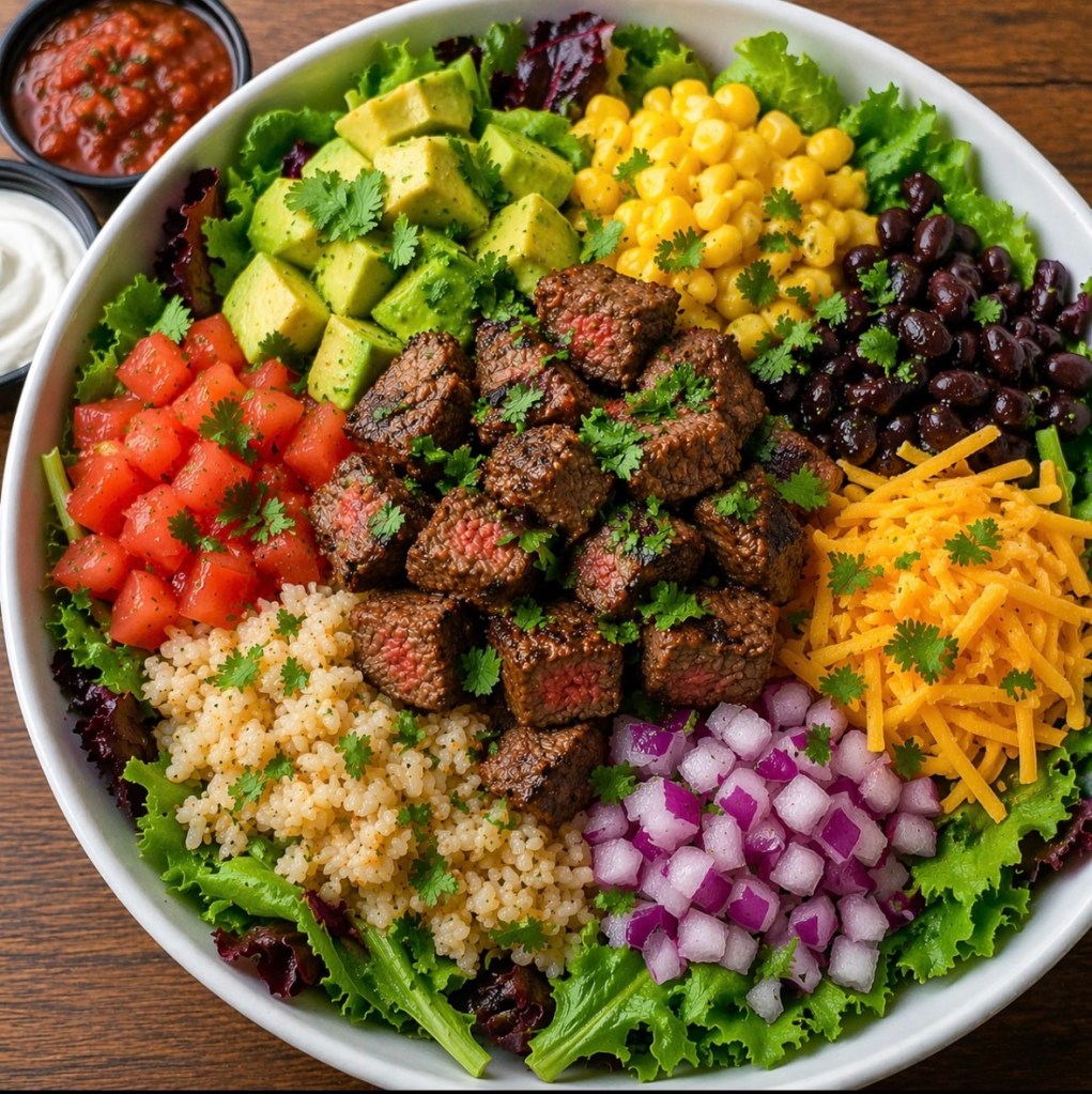 Spring mix with rice, seasoned steak, black beans, corn, tomatoes, red onion, avocado, cilantro, cheddar, with salsa & sour cream.VEGAN AVAILABLE!!!